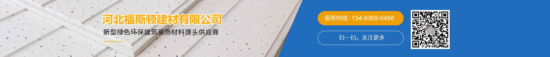 河北福斯頓建材有限公司位于河北省晉州市,是一家專業(yè)生產銷售:硅酸鈣板、纖維水泥板、礦棉板、硅酸鈣天花板、冰火板、烤漆龍骨、水泥壓力板的生產型企業(yè),我公司專注于高品質、節(jié)能、環(huán)保、綠色建材產品的設計、研發(fā)、生產、銷售于一體的創(chuàng)新企業(yè)。 公司致力于研發(fā)生產新型綠色環(huán)保建筑裝飾材料,可生產各種型號硅酸鈣板、纖維水泥板、礦棉板、硅酸鈣天花板、冰火板、烤漆龍骨、水泥壓力板等建材,產品性能穩(wěn)定、價格合理,廣泛...